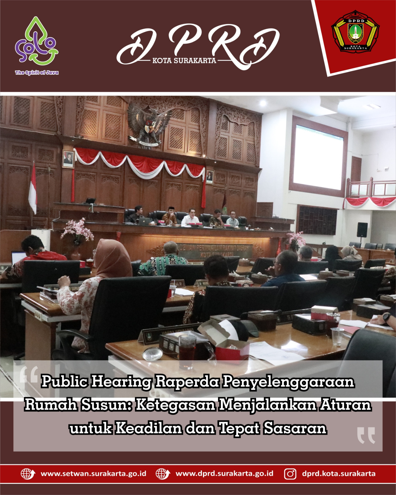 SURAKARTA - Dewan Perwakilan Rakyat Daerah (DPRD) Kota Surakarta melalui Panitia Khusus (Pansus) Raperda Penyelenggaraan Rumah Susun menggelar Public Hearing bersama tokoh masyarakat, paguyuban penghuni rumah susun, dan Organisasi Perangkat Daerah (OPD) terkait, di Grha Paripurna, Kamis (3/7). Forum ini digelar untuk menyerap aspirasi masyarakat sebelum Raperda disahkan menggantikan Perda Nomor 7 Tahun 2011.